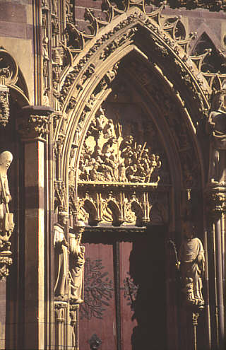 des Westportals enthält in 5 Bildzonen eine Darstellung des Marienlebens. |