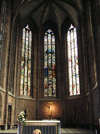 Seiten des Achtecks geschlossene Apsis und hohe Maßwerkfenster.