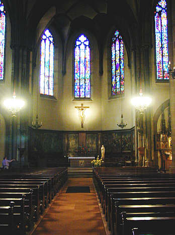 Unten Chor des neugotischen Baus von 1866. An den Chorwänden Tafelbilder mit der Passion Christi, um 1480, aus der früheren Magdalenenkirche.