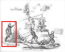 Ein Kosake (Personifikation Russlands) mit der dreischwänzigen Peitsche drückt die Waage noch zusätzlich nach unten, stützt also das unterdrückerische System der Kleinstaaterei |