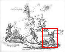 Friedrich Hecker kniet auf der Fahne der Republik und beschwert die Waagschale mit dem Parlament zusätzlich mit Kanonenkugeln, da nur sie allein der Sache der Revolution das nötige Gewicht geben können. |