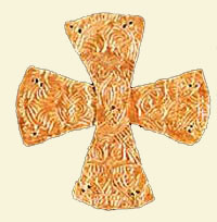 Goldblattkreuze aus dem alamannischen Gräberfeld zu Lauchheim. Solche Kreuze wurden, auf ein Grabtuch aufgenäht, dem Toten auf Gesicht und Mund gelegt. Diese Sitte hatten die Alamannen von den Langobarden aus Italien übernommen.