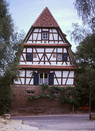 Kelterscheuer als letzter Rest der Baulichkeiten des seit 1710 im Besitz der Grafen von Neipperg befindlichen Anwesens.
