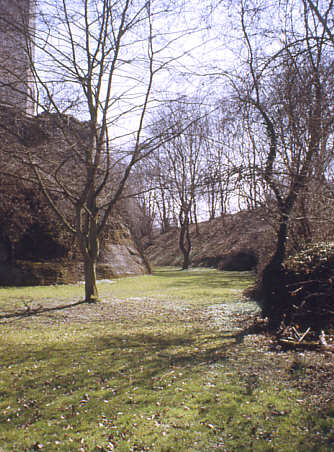 Künstlich in den anstehenden Fels eingetiefter Halsgraben. Links die Hauptburg.