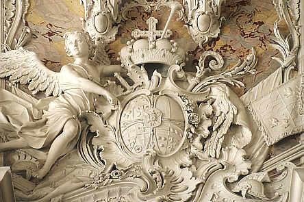 Schloss Augustusburg, Brühl: Fama mit dem kurfürstlichen Wappen im Treppenhaus. Stuckarbeit von Giuseppe Artario. Aufnahme: Rüdiger Block,