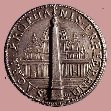Münze von Sixtus V. mit dem Obelisken auf dem Petersplatz (Rückseite)