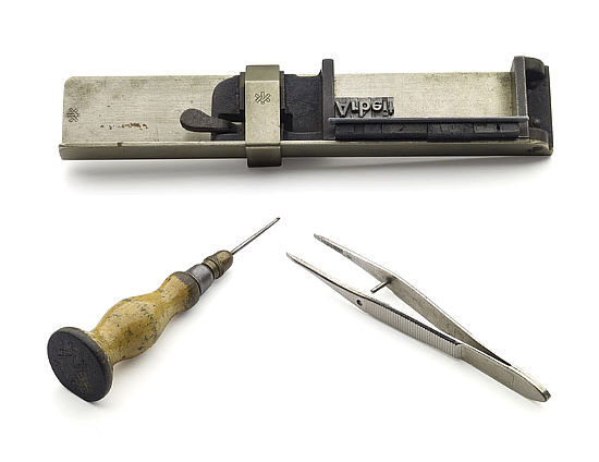 Utensilien für den Handsatz: Winkelhaken mit Bleilettern,