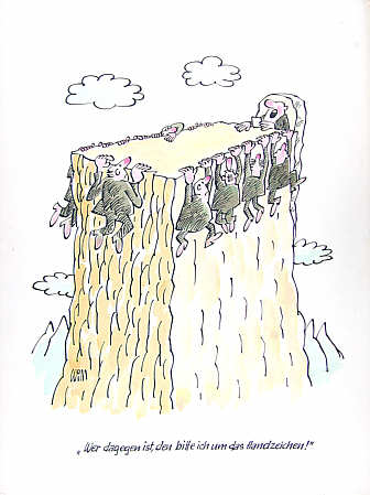 Die Urfassung der Karikatur hängt 1986 in Greiz. Versehentlich, so berichtet der Künstler später, sendet er sie zur Biennale des "Satiricums". Sie ist im Bericht des DDR-Fernsehens zu sehen, 1987 sogar auf der X. Kunstausstellung in Dresden.