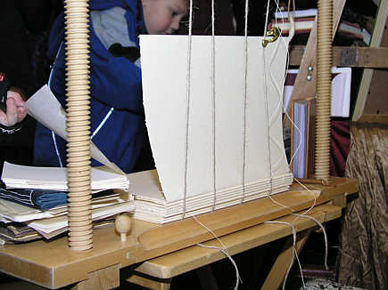 Buchbinden war natürlich Handarbeit. Papierlagen wurden gewissermaßen auf die Heftfäden genäht, bevor der Buchblock gebunden wurde.