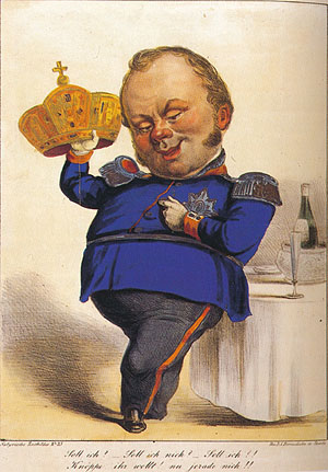 "Soll ich oder soll ich nicht?" Karikatur auf die Ablehnung der Kaiserkrone durch König Friedrich Wilhelm IV. von Preußen. Kolorierte Druckgraphik, 23x32 cm. Mannheim, Landesmuseum für Technik und Arbeit. Aus der Ausstellung "Revolution der deutschen Demokraten in Baden", Karlsruhe. Kat.- Nr. 368.