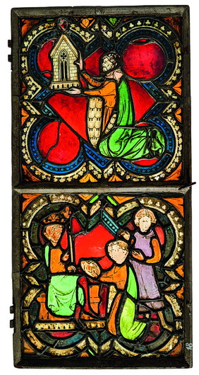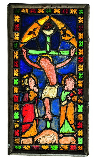 Kreuzigungsszene, um 1286/90 (links), Stifterscheibe mit Darstellung