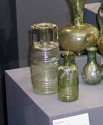 Flaschen mit angedeuteten Fassdauben als Dekor waren vor allem zum Ausschank von Wein sehr beliebt. 4. Jh. n. Chr. Karlsruhe, Badisches Landesmuseum