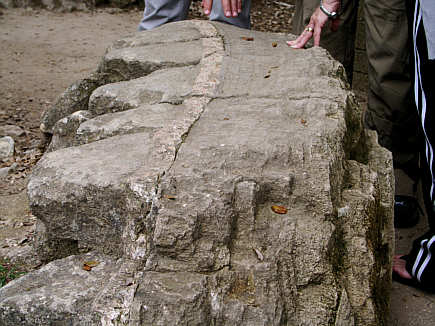 Kalkablagerungen im Kanal (an der Biegung zwischen Aquädukt und gemauertem Kanal am Berghang). Links die Mauerung des Kanals, rechts die 30 - 40 cm dicken dicken Kalkablagerungen, dazischen die Estrich-Schicht.
