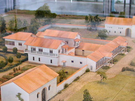 Rekonstruktionsmodell der Villa nach der jüngsten Steinbauphase, Sicht von Nordwesten Detail: Das Hauptgebäude mit dem überdachten Säulengang im Westen, im Vordergrund der Speicherbau