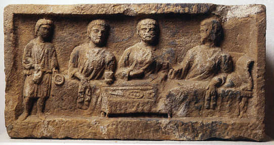 lagern auf einer Kline um einen rechteckigen Tisch, auf dem Geschirr
