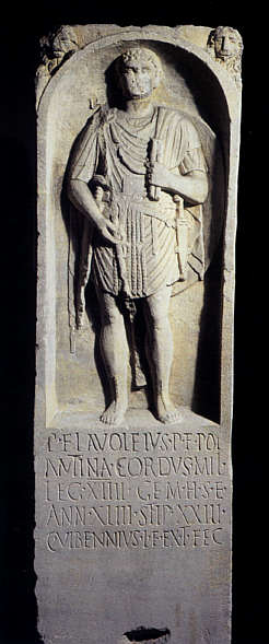 Der Grabstein des Publius Flavoleius Cordus zeigt den Verstorbenen mit Schwert, Dolch und Mantel. Einzelne Elemente wie Dolchscheide oder Riemenwerk der Sandalen waren nur aufgemalt.