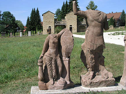 Auf dem Lagergelände vermitteln Kunststeinkopien von römischen Fundstücken einen Eindruck von den Erscheinungen römischer Religiosität
