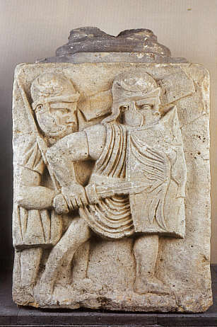 Das Sockelrelief aus der frühflavischen Zeit zeigt zwei Legionäre, von denen der vordere mit Schwert (Typ Pompeji) und Schild bewaffnet ist. Beide tragen einen Helm vom Typ Weisenau.