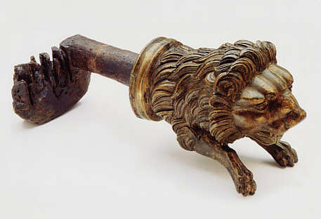 in Gesalt eines springenden Löwen über den Schaft gegossen.