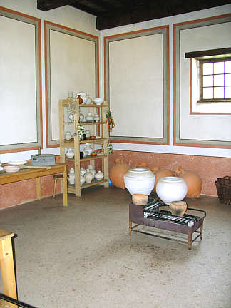 Küche mit Aufbewahrungsgestell sowie Krügen und Amphoren als Vorratsgefäße