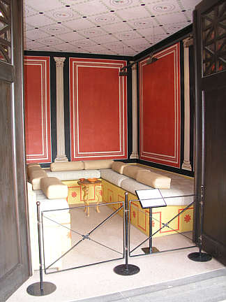 Speiseraum (Triclinium) mit der charakteristischen Anordnung der Liegen. Gegessen wurde in aufgestützt liegender Haltung, nur mit einem Löffel
