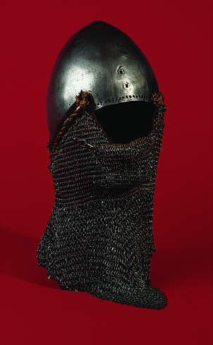 Beckenhaube mit RingpanzerbrünneAus Kettengeflecht gearbeiteter Schutz, der Kinn, Hals und Schultern bedeckt (Helmbrünne) und der am Helm, der Beckenhaube, befestigt ist. Deutschland um 1360 |