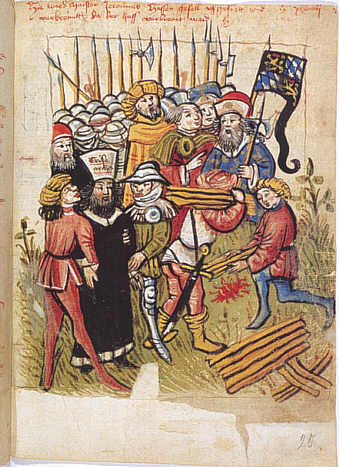 Das Konstanzer Konzil 1414-1418 Chronik des Ulrich von Richenthal, St. Georgener Exemplar Die Miniatur zeigt die Hinrichtung des Hieronymus von Prag, eines Anhängers der Lehre von Jan Hus am 30. Mai 1416 unter der Leitung des kaiserlichen Protektors, des Pfalzgrafen Ludwig III., der an der Fahne mit dem pfälzischen Wappen erkennbar ist. Hieronymus von Prag trägt eine Ketzermütze mit der Aufschrift "Erzketzer", Knechte tragen bereits Holz für den Scheiterhaufen herbei. Interessant ist die Darstellung des Pfalzgrafen als älteren, bärtigen Mann - in einer anderen Version der Chronik wird er als jugendlicher Held dargestellt. |
