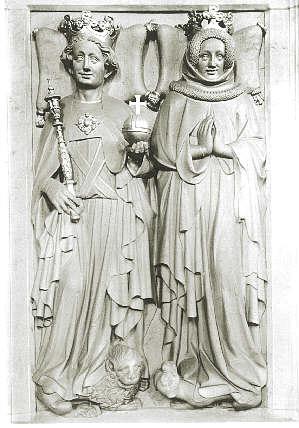 König Ruprecht, + 1410Grabmal König Ruprechts, Pfalzgraf und Kurfürst bei Rhein, und seiner Frau Elisabeth von Hohenzollern im Chor der Heidelberger heiliggeistkirche Ruprecht III. war Kurfürst von 1398 - 1410 und von 1400 - 1410 als Ruprecht I. deutscher König. Mit seinen Söhnen teilten sich die pfälzischen Wittelsbacher vor allem in die ältere Kurlinie (die mit Kurfürst Ottheinrich 1559 ausstarb) und die Linie Zweibrücken-Simmern, von denen ein Zweig das bayerische Herzogshaus bis heute fortsetzt. Kurfürst Ruprecht ist der Bauherr des Ruprechtsbaus im Heidelberger Schloß |