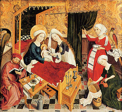 Linke Flügelinnenseite eines ehemaligen Retabels aus dem Kloster Ottobeuren (?) Oberrheinischer Meister. Um 1460/65 Die Geburt Mariens wird vom Maler in die Schlafstube einer repräsentativ ausgestatteten Wohnung verlegt. |