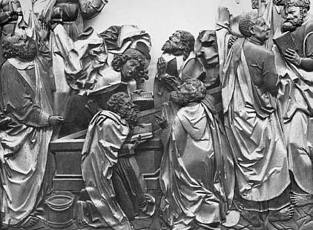 Das Relief zeigt die Jünger um den leeren Sarkophag versammelt, doch deutet die Komposition der Figuren darauf hion, dass sie das Ereignis der aufnahme Mariens in den Himmel noch nicht vergegenwärtigt haben. Nur einige der Apostel wenden ihren Blick bereits nach oben, wo in der vollständigen Tafel die Aufnahme Marias in den Himmel vermutet werden muss. Links am Bildrand Petrus, der, im Begriff, den Leichnam einzusegnen, überrascht nach oben blickt.