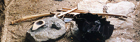 Dahinter der Feuerbogen und drei Feuerhölzer, die mit dem Bogen