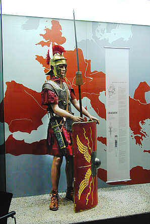 mit Rüstung, Helm, Schild, Lanze und Kurzschwert; dahinter eine Karte des Römischen Weltreichs.