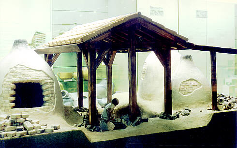 Modell einer römischen Töpferei: Überdachte Arbeitsgrube zwischen zwei runden Brennöfen.