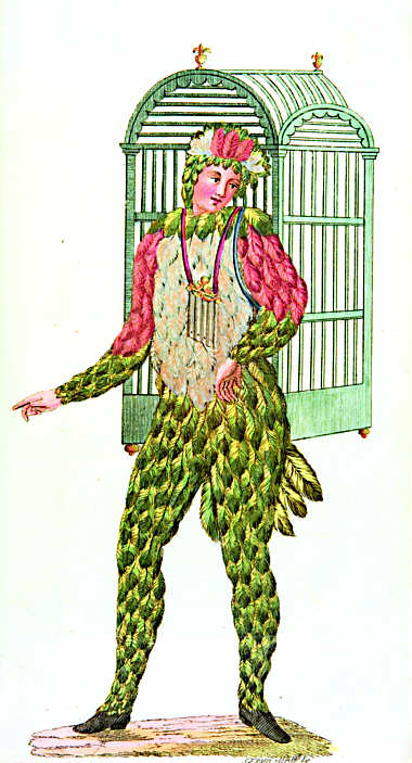 Franz H. Wolff, 6 Kostüme zur Zauberflöteninszenierung, Mannheim 1794, in: Rheinische Musen. Zeitung für Theater und andere schöne Künste, 1794 und 1795: Papageno (Heidelberg, Universitätsbibliothek)