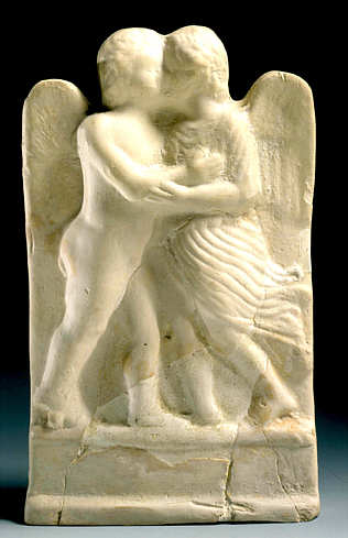 Tonrelief zeigt das kindliche und geflügelte Paar in Dreiviertelansicht,