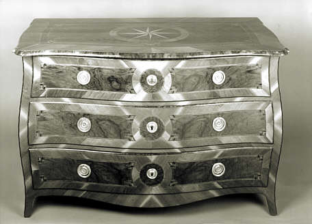Die Straßburger Kommoden zeichnen sich durch eine Dreischubigkeit aus, die bei den Pariser Stücken dieser Zeit schon aufgegeben ist, und durch eine gewisse Schwere in der Linienführung, die sonderbarerweise mit einer fortschrittlichen, den neuen Ornamentformen des Stiles Louis Seize verpflichteten Marqueterie kontrastiert. Oft werden statt der im französischen Bereich üblichen Marmorplatten auch Holzdeckplatten verwendet, was eine gewisse bürgerliche Behaglichkeit aufkommen lässt. Die Werkstatt des Mannheimer Hofebenisten Jacob Kieser nimmt gerade diese stilistischen Eigenheiten auf und schafft fast identische Stücke. Tradition und Fortschritt verbinden sich - die Mischung aus französischer Grazie und bürgerlicher Behäbigkeit entspricht in idealer Weise auch den Lebensformen des Pfälzer Hofes. Gesicherte Zeugnisse aus der Werkstatt Kiesers finden sich im Badhaus des Kurfürsten Carl Theodor im Schwetzinger Schlosspark in den beiden Kommoden im Schlafzimmer, den Vertäfelungen und dem Sekretär des Schreibzimmers und den vier Encoignuren" (Eckschränken) des chinesischen Theezimmers". Die Kommode kam vermutlich aus dem Besitz der Fürsten von Bretzenheim, die sich zu Beginn des 19. Jahrhundert in Ungarn niederließen, an die Vorbesitzer. Carl Ludwig Fuchs |