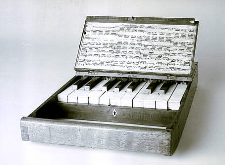 | Das stumme Klavier in Form einer kleinen Reisetasche begleitete