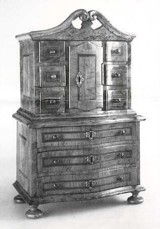 Das 60 cm hohe Miniaturmöbel wurde vermutlich weder als Gesellenstück, noch als Modell für ein anzufertigendes Großstück hergestellt, sondern zum Zweck einer Benutzung als Behältnis für Schmuck, Sammelgegenstände und kleine Geheimnisse. Dafür spricht die verhältnismäßige Größe der Aufsatzkommode, die bequem eine Fülle kleiner Gegenstände aufnehmen kann und auch als Zierstück in der "Putzstube" des Bürgers zur Geltung kommt. Das Möbelstück befand sich seit der ersten Hälfte des 19. Jahrhunderts in Mannheim, dürfte also in der Pfalz hergestellt sein. Die schwere Form der Kommode, der sehr gewichtige Aufsatz mit der Tabernakeltür und der geschweifte Giebel erinnern an Werke des kurpfälzischen Hofschreiners Franz Zeller, von dem sich eine Anzahl ähnlicher Großmöbel im Besitz der badischen Schlösserverwaltung erhalten hat