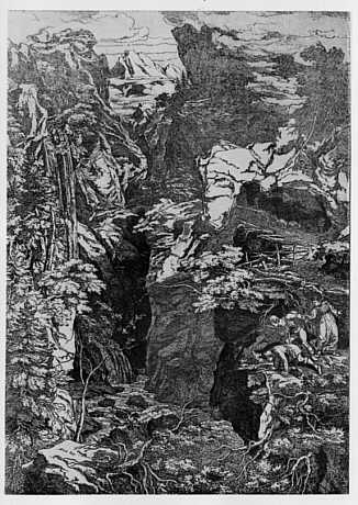 Die von Ernst Fries verfertigte Lithographie ist im Stein F. nach W." bezeichnet. Dementsprechend wird vermutet, dass Fries die Federzeichnung der Via Mala" für eine Arbeit von Georg Augustus Wallis (1770-1847) hielt, der ihm in vielem ein Vorbild war. Man kann jedoch davon ausgehen, dass in diesem Fall weniger der Künstler als die Wahl des Sujets, des Naturausschnittes für Fries ausschlaggebend war. - Ernst Fries beschäftigte sich intensiv mit den technischen Möglichkeiten der Lithographie, insbesondere mit der Verwendung von Tonplatten, um mit Blick auf die Maßgaben von Lavierungen und Weißhöhungen der Vorlagen die malerische Wirkung der Ansichten zu erhöhen und eine möglichst hohe Plastizität und Lebendigkeit der Oberflächenstrukturen zu erreichen. Ein besonders gelungenes und virtuos umgesetztes Beispiel ist dieses Blatt, das er nach einer lavierten Federzeichnung in Grau und Braun von Koch seitenverkehrt reproduzierte. Die mehrere hundert Meter tiefe klammartige Schlucht wird von Fries in starker Nahsicht wiedergegeben, wie ein Denkmal, ein majestätisches Naturmonument, das sich bis in den Himmel türmt. Textvorlage: Anja-Maria Roth |