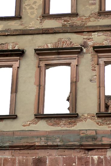 Auf seiner Rückseite zum alten Schlossgraben zeigt der Englische Bau eine völlig andere Ansicht, die Fassade ist nur durch Horizontalgesims und profilierte Fenterumrahmungen gegliedert. Rechts im Bild eine Ecke des Bibliotheksbaus, links die Stützmauer des Sückgartens.