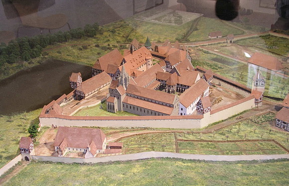 Ansicht von Nordwesten: vorn die Klosterkirche, dahinter der Kreuzgang mit