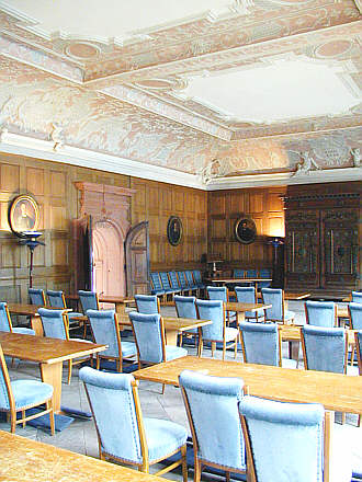 jetzt quergerichtet. Das barocke Eingangsportal stammt von 1720, die Stuckdecke
