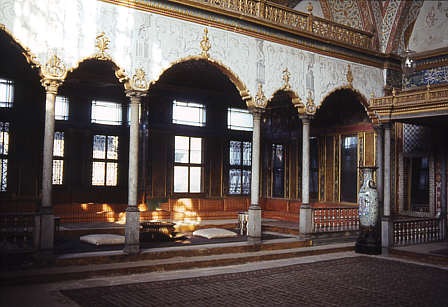Nach der Eroberung Istanbuls im Jahre 1453 baute Sultan Mehmet II. einen Palast auf der Landzunge, an der Bosporus und Goldenes Horn aufeinander treffen. Dafür wurde ein etwa 60 Hektar großes Areal frei gemacht. Das einzige Gebäude, das dort stehen blieb, war die alte byzantinische Kirche der Heiligen Irene, die der Palast fortan als Arsenal nutzte. Der Palastkomplex besteht nicht aus einem Monumentalbau, sondern aus einer Aneinanderreihung großer und kleiner Bauten, Gärten, Höfe und Tore. Durch das Kaisertor gelangt man in den ersten Hof, den Außenhof , auf dem sich Einrichtungen wie die Krankenstation, Magazine, Pferdeställe und Schlafsäle befinden. Dann folgt der zweite Hof, zu dem das Mitteltor nur einer kleinen Gruppe von Auserwählten Zugang verleiht. Dieser breite Platz wird seitlich von den Küchen des Serails begrenzt. Auf der gegenüberliegenden Seite befindet sich der Sitzungssaal des Diwans (Staatsrat). Hier fanden verschiedene eindrucksvolle Zeremonien statt, darunter die Soldauszahlung des Elitekorps der Janitscharen und die Audienzen für die ausländischen Botschafter. Dann setzte sich der Monarch auf seinen Thron, der im Thronsaal direkt hinter dem Tor des Glücks steht, das in seine Privatgemächer führt. Der Sultan empfing die Fremdlinge also auf der Grenze zwischen seiner öffentlichen und privaten Existenz.
