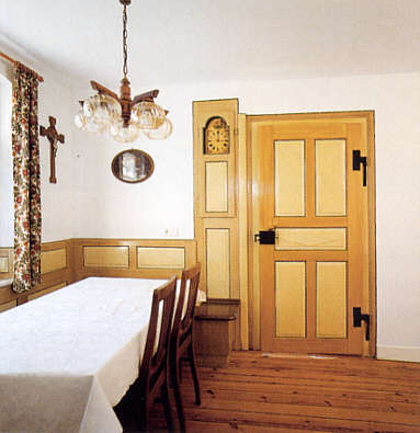 Esszimmer mit bauzeitlicher Tür, Täfer und Eckbank.