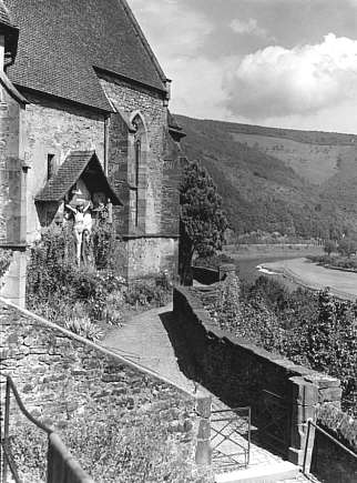 Kruzifix an der Karmeliterkirche. Im Hintergrund der Neckar (flussaufwärts gesehen) Badische Bahnlinie Heidelberg - Würzburg |