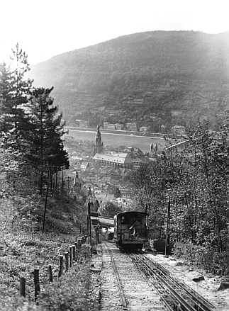 Bergbahn zum Königstuhl mit Blick auf die Heiliggeistkirche in der Altstadt Badische Bahnlinie Heidelberg - Würzburg |