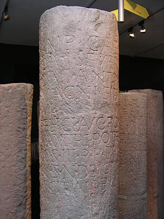 Leugenstein des M. Aurelius Antoninus, gen. Elagabal, 4 Leugen von Lopodunum (=Ladenburg), Heidelberg Der Name Elagabals wurde vom Stein gelöscht, als der Kaiser der damnatio memoriae, der Tilgung seines Andenkens verfiel.