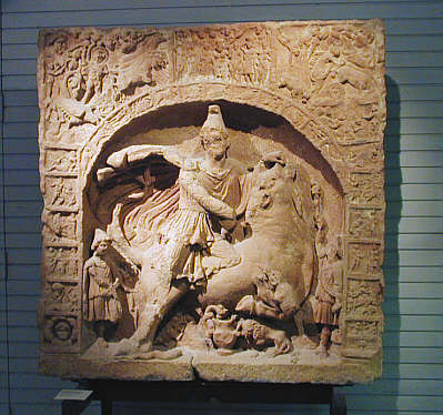 Osterburkener Mithrasstein 2. Jahrhundert n. Chr., Osterburken Kultbild aus dem Mithräum von Osterburken. Darstellung der Stiertötung (Tauroktonie), auf dem Rand Szenen aus dem Mithras-Mythos