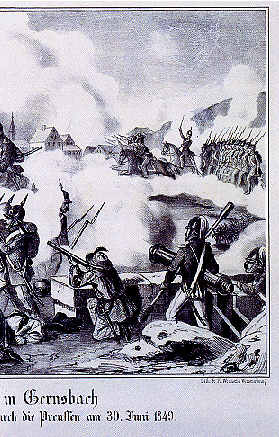 Stereotype, nicht authentische Darstellung des Gefechts zwischen den badischen Revolutionstruppen und der preußischen Interventionsarmee am 29. Juni 1849. Zugunsten einer schnellen Verbreitung wurde auf originalgetreue Darstellung des Schauplatzes verzichtet. Bad. Landesmuseum Karlsruhe, Kat. Nr. 72 |