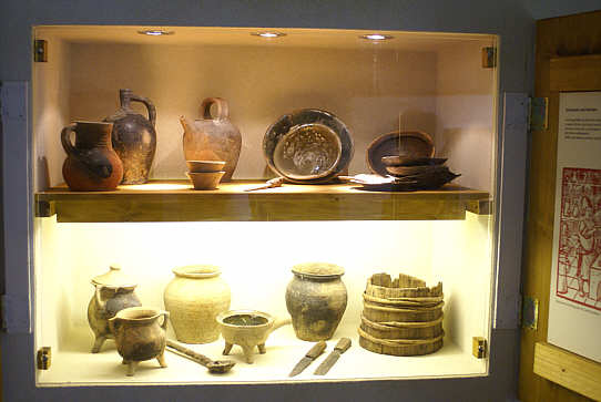 Das Geschirr für den Alltag ist aus einfachem Ton, nur das kostbare Geschirr für die Festtage ist mit mehr Aufwand hergestellt. Die Töpfe mit den Füßen werden in die Herdglut gestellt, und die Füße verhindern, dass der Topf umfällt.
